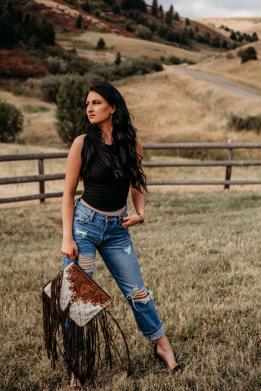 Genuine Western Cowhide Leather Purse and Clutch with white floral painted details a Double B Wild Rags Exclusive