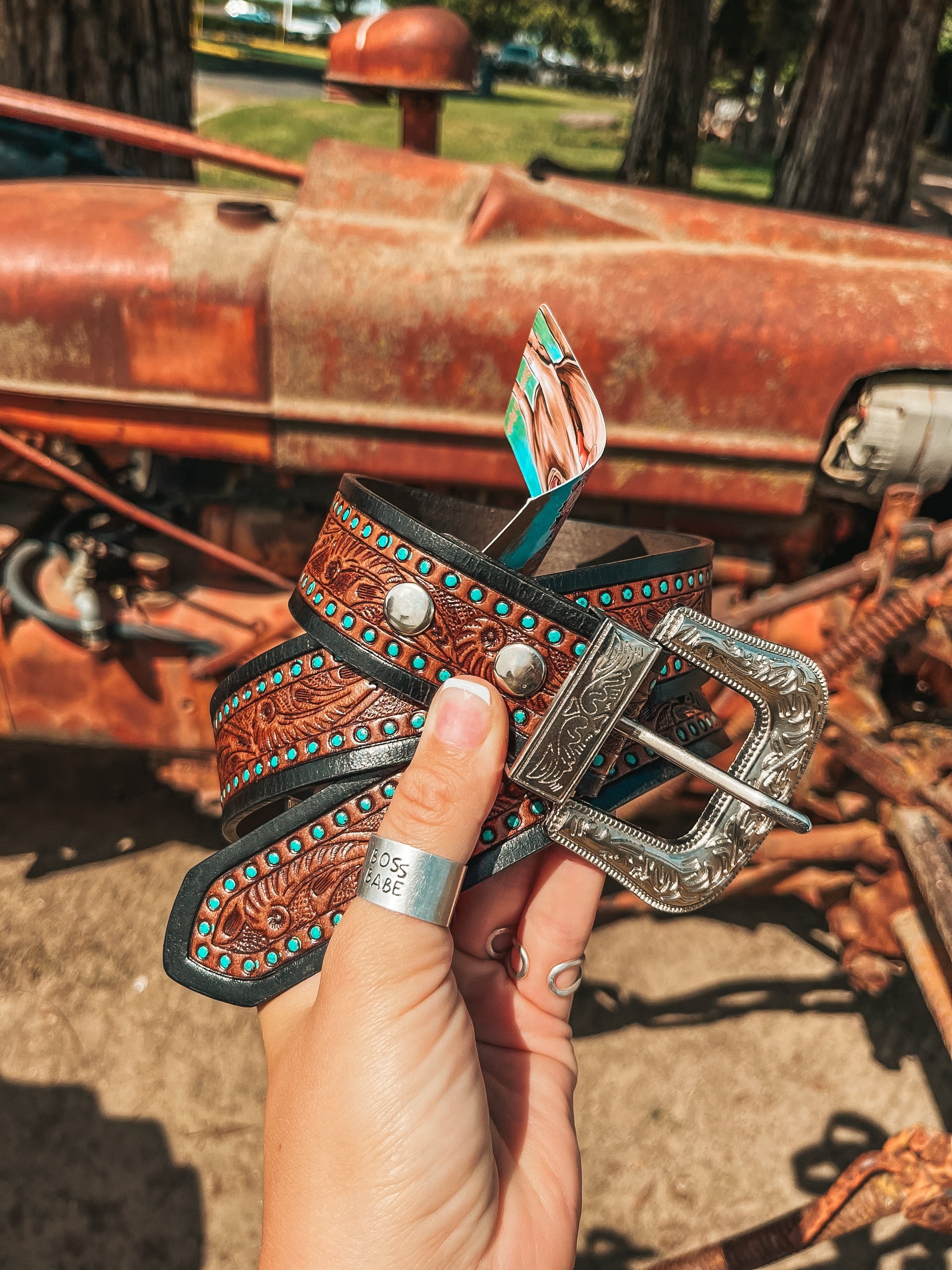 Turn up the Western charm with this hand-painted tooled leather belt, featuring bold leather carving and rich detailing along every inch. The soft pops of teal blue highlight the tooled design, giving it a standout look without going over the top. Finished with an engraved silver buckle, this belt is built to last and made to be noticed.