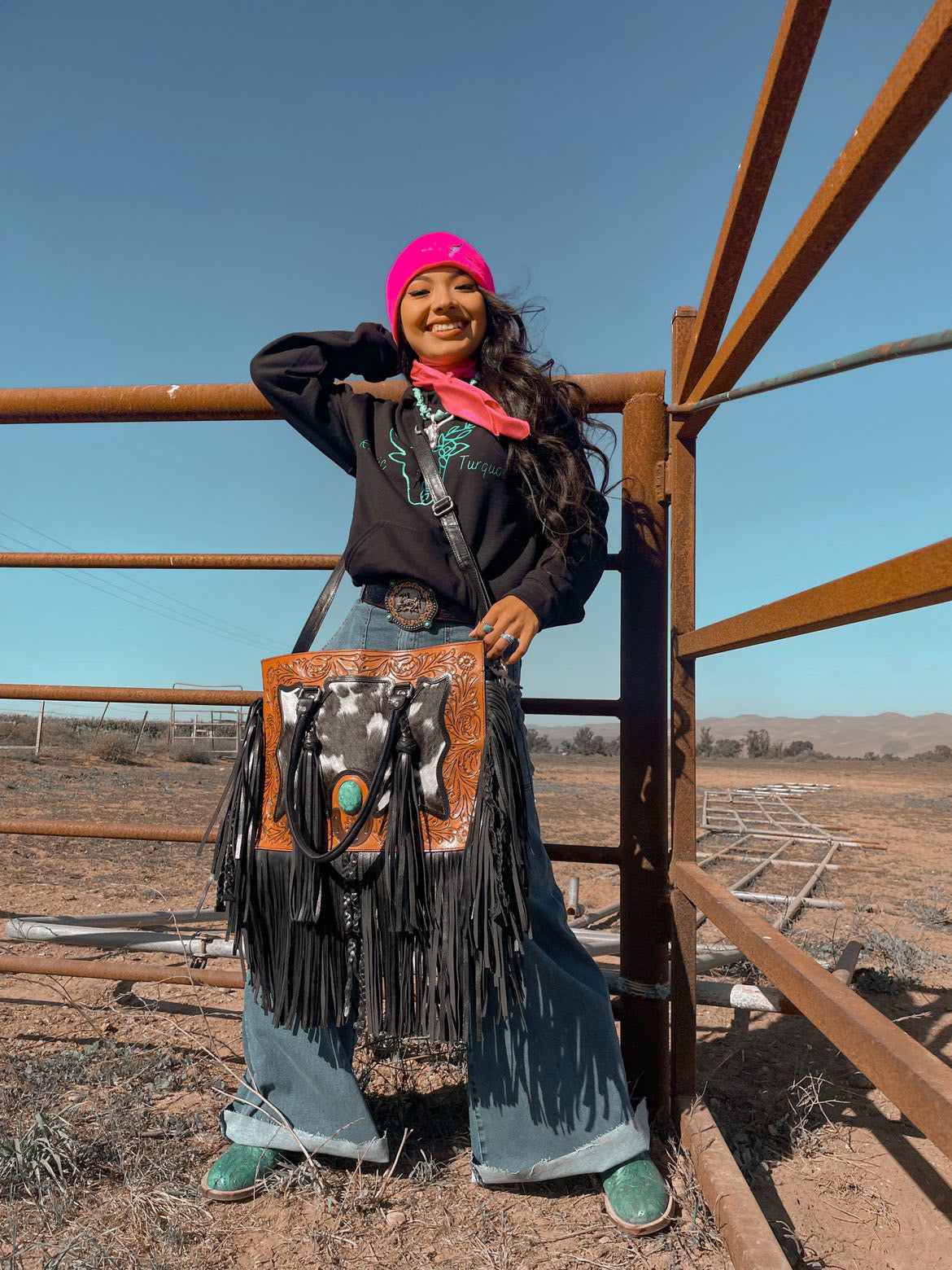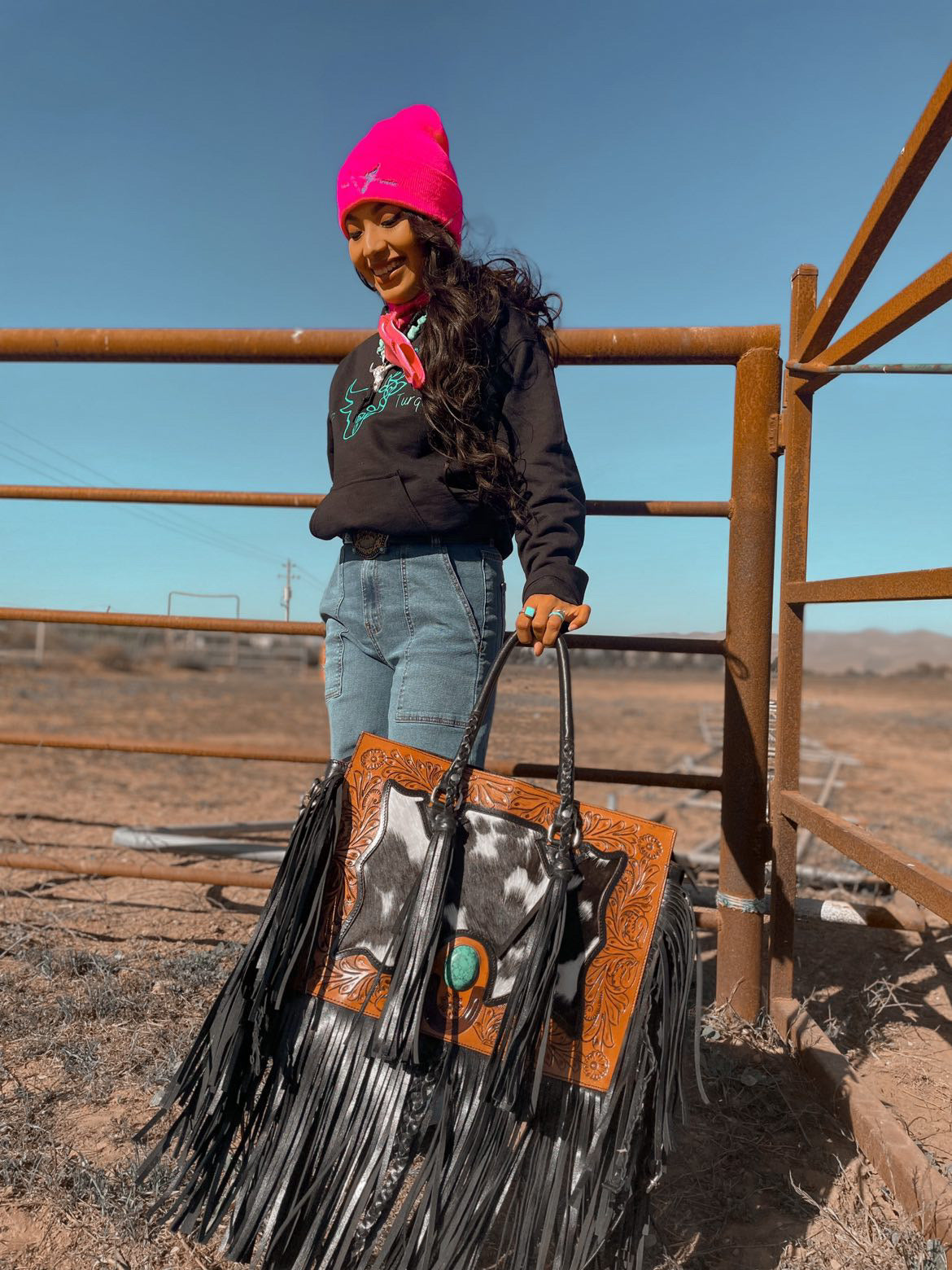 The Nashville Gunner boasts a sexy red velvet interior, a Concealed Carry Pocket in the rear accessible for left/right carry, huge storage capacity, both top handles and a shoulder strap, and a beautiful faux turquoise stone. The interior contains two cubby pockets and one zipper pocket. Please note our latest batch was made without the red velvet and was made with a brown velvet material. The photo does show the layout of interior, however the color will be different for the interior on this batch. Made with genuine leather and cowhide. The Nashville Gunner is a head turning Gem!