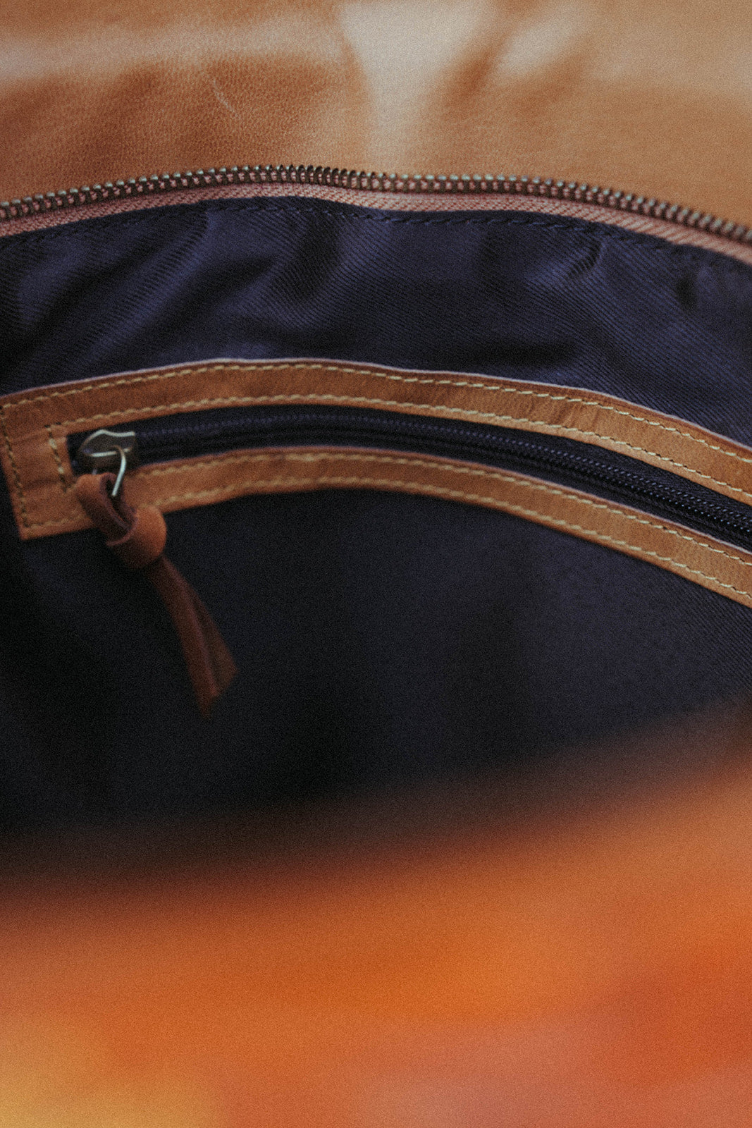 The dimensions for this purse are 14.5” x 16”. The fully lined interior contains one zipper pocket and two cubby pockets.